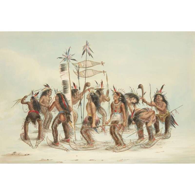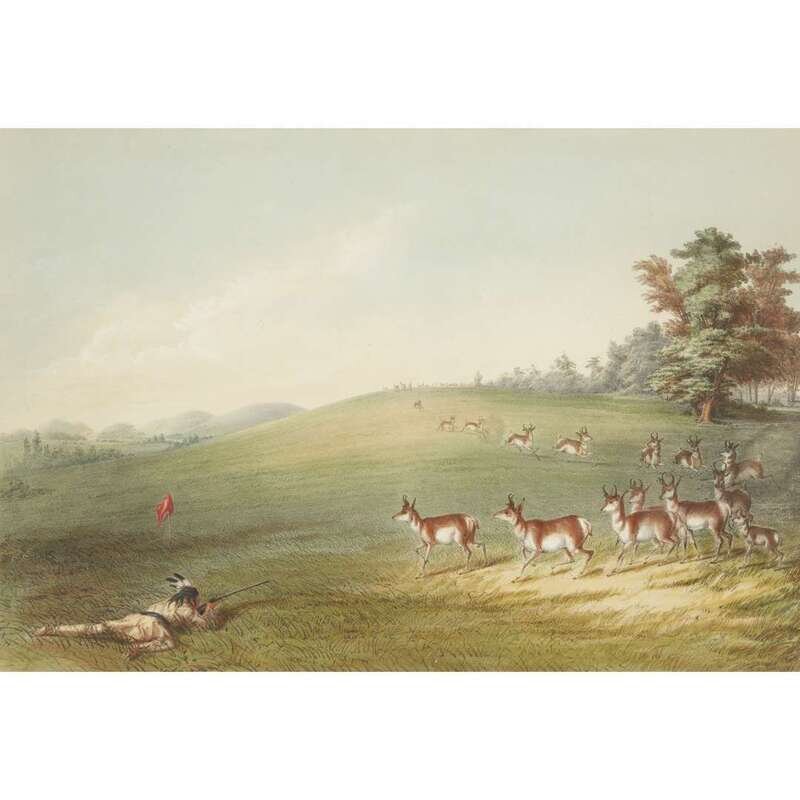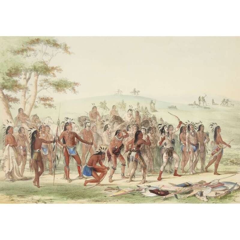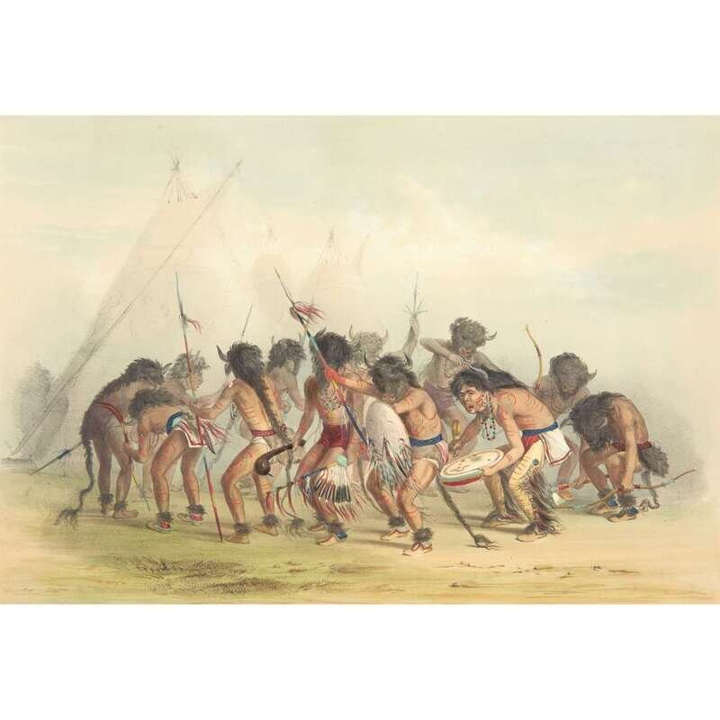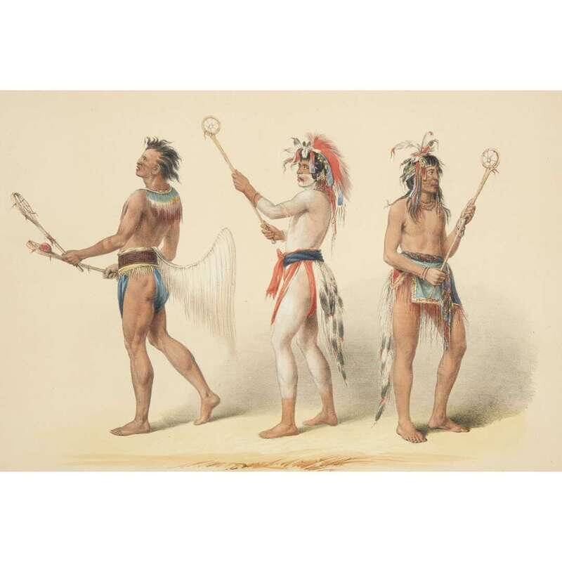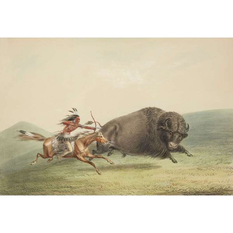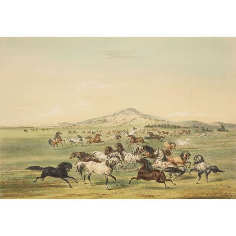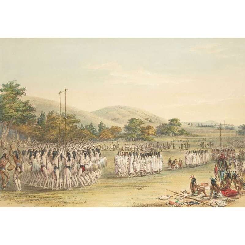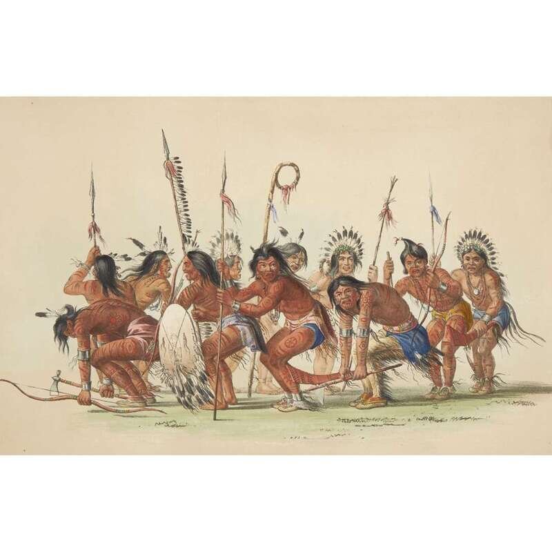London, 1844 and later. Near complete set, comprising 29 (of 31) hand-colored lithographs after Catlin. Mounted on cards within hand-drawn ink-ruled frames, many heightened with gum arabic; without printed captions. Card mounts: 18 x 23 1/4 in. (457 x 590mm), with minor variations; plates: 12 x 17 1/2 in. (305 x 445mm), with minor variations. Each sheet corner tape mounted, matted and in frame. See Wagner-Camp 105a:2; see Howes C243; see Field Indian Biography 258; see Siebert Library 844 & 846; see Reese, William S, "The Production of Catlin's North American Portfolio, 1844-1877."