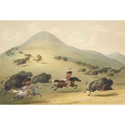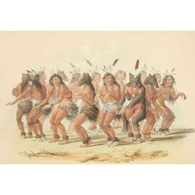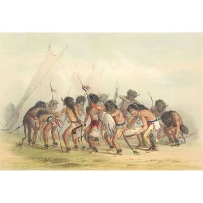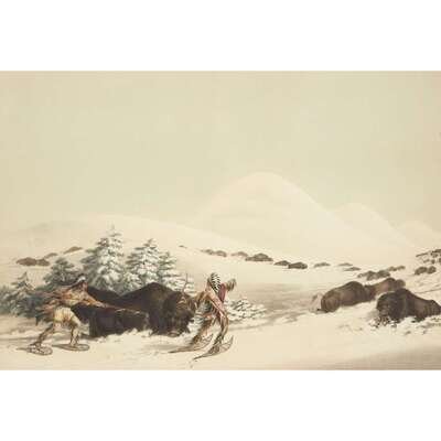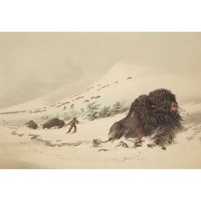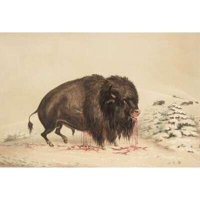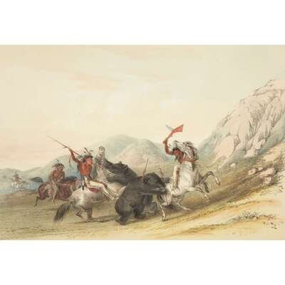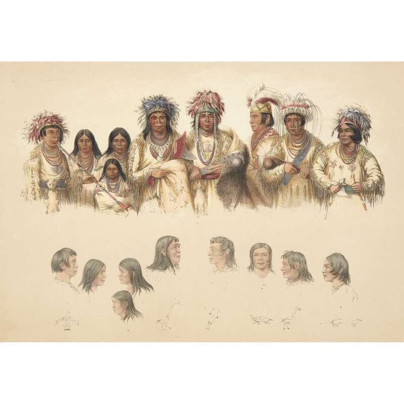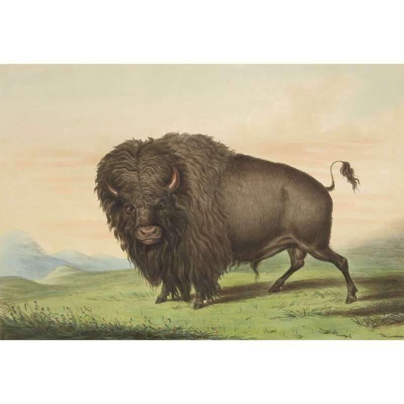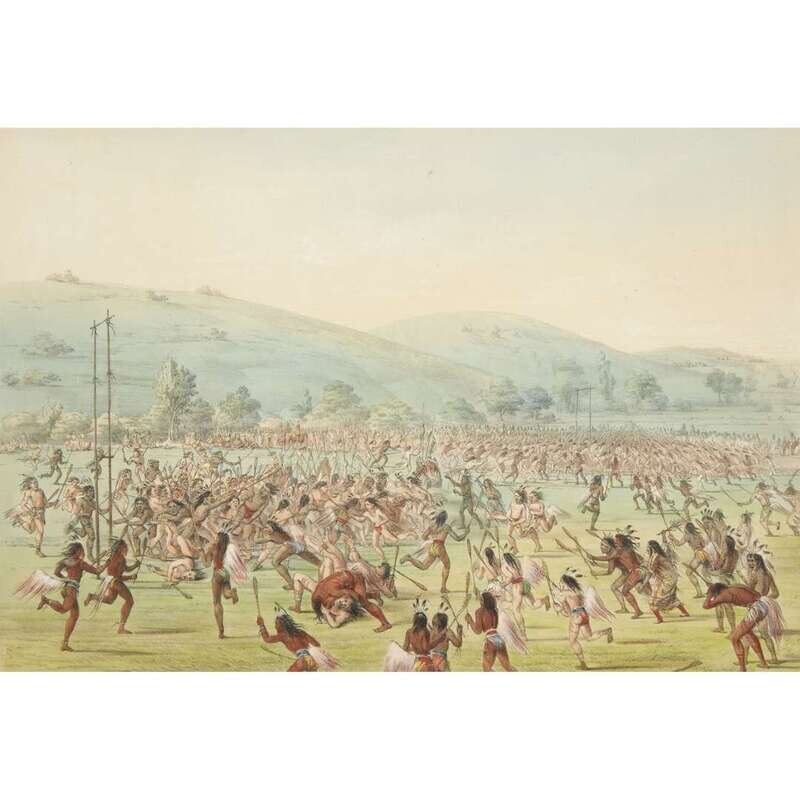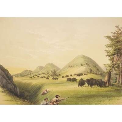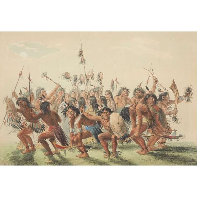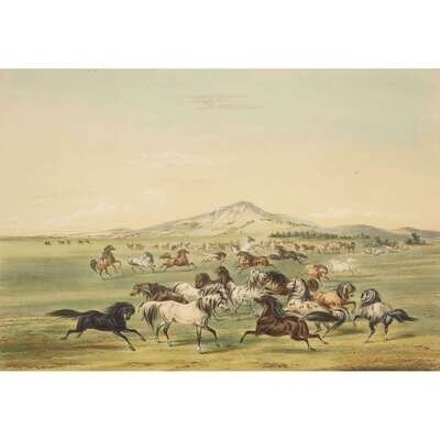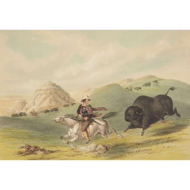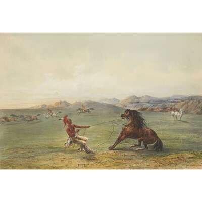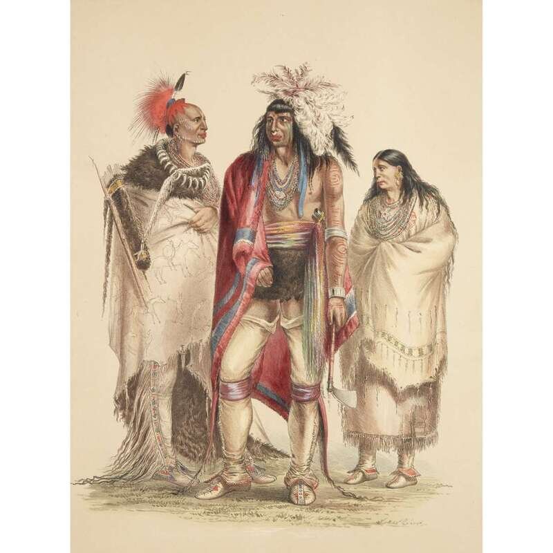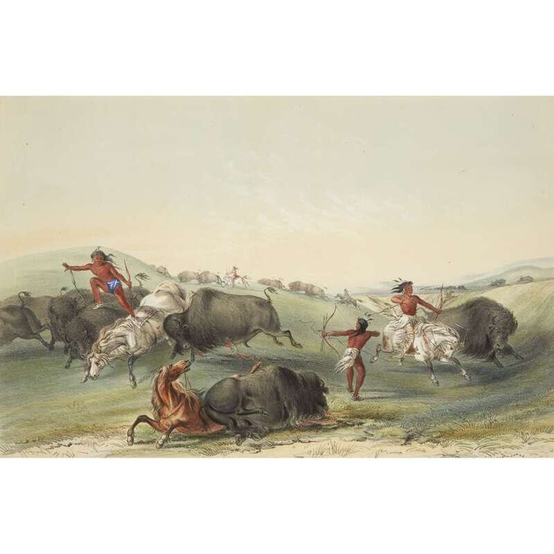 London, 1844 and later. Near complete set, comprising 29 (of 31) hand-colored lithographs after Catlin. Mounted on cards within hand-drawn ink-ruled frames, many heightened with gum arabic; without printed captions. Card mounts: 18 x 23 1/4 in. (457 x 590mm), with minor variations; plates: 12 x 17 1/2 in. (305 x 445mm), with minor variations. Each sheet corner tape mounted, matted and in frame. See Wagner-Camp 105a:2; see Howes C243; see Field Indian Biography 258; see Siebert Library 844 & 846; see Reese, William S, "The Production of Catlin's North American Portfolio, 1844-1877."