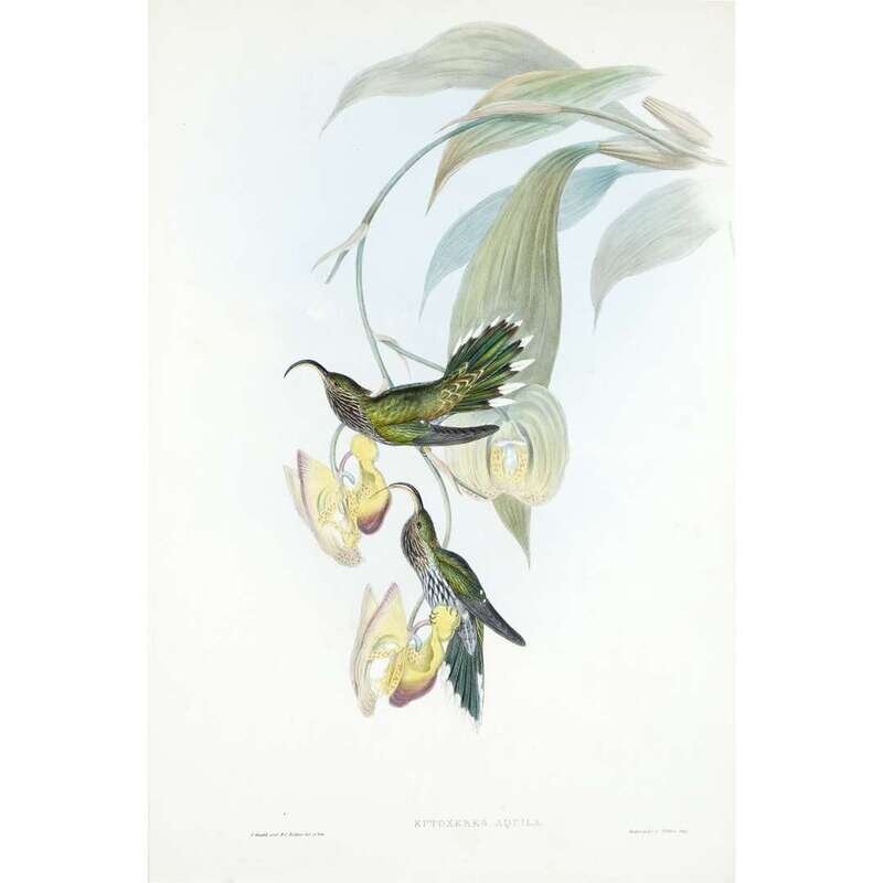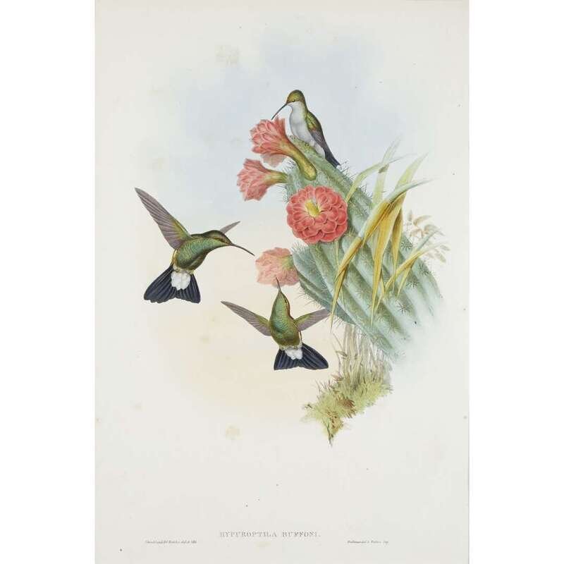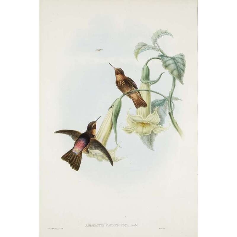 Hand-colored lithographs, embellished with gum arabic. From "A Monograph of the Trochilidae, or Family of Hummingbirds" (London, 1849-1887). Each matted and in frame. Including: 1. Gould, John, and W. Hart. "Aglaeactis Caumatonota" (Black-throated Sunbeam). Printed by Hullmandel and Walter. 20 5/8 x 13 3/4 in. (524 x 351 mm). 2. Gould, John, and H.C. Richter. "Hypuroptila Buffoni" (Buffon's Plumelteer). Printed by Hullmandel and Walter. 20 1/2 x 13 3/4 in. (521 x 351 mm). Scattered light foxing. 3. Gould, John, and H.C. Richter. "Euxtoxeres Aquila" (Sickle Bill). Printed by Hullmandel and Walter. 20 1/2 x 13 3/4 in. (521 x 351 mm).