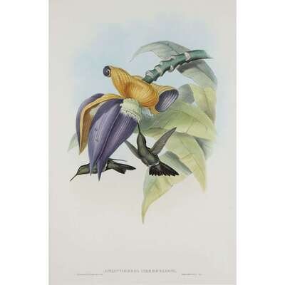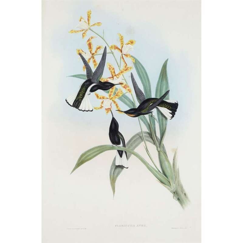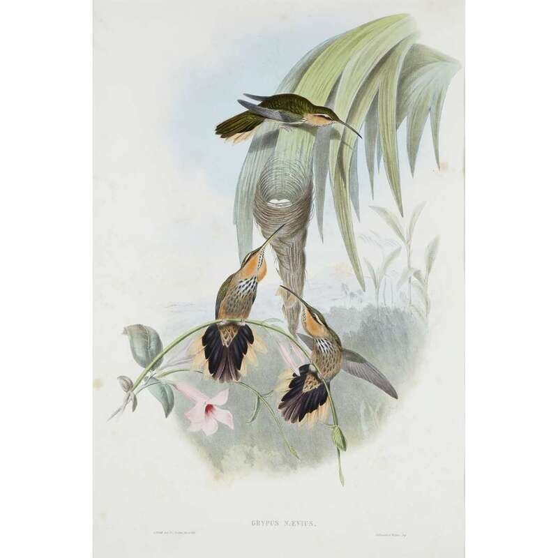 Hand-colored lithographs, embellished with gum arabic. From "A Monograph of the Trochilidae, or Family of Hummingbirds" (London, 1849-1887). Each matted and in frame. Including: 1. "Aphantochroa Cirrhochloris" (Somber Hummingbird). Printed By Hullmandel and Walter. 20 1/2 x 13 3/4 in. (521 x 351 mm). 2. "Grypus Naevius" (Saw-bill). Printed by Hullmandel and Walter. 20 1/2 x 13 1/2 in. (521 x 343 mm) Scattered light foxing. 3. "Floriduga Atra" (Pied Jacobin). Printed by Hullmandel and Walter. 20 1/2 x 13 5/8 in. (521 x 346 mm).