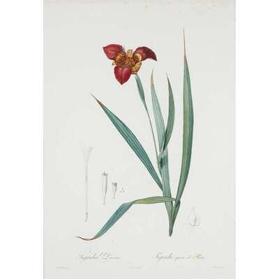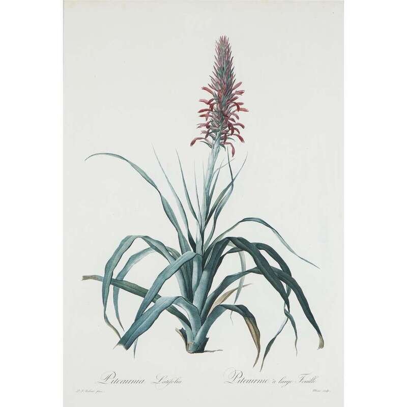 Stipple engravings, printed in color and finished with hand-coloring. From "Les Liliacees" (Paris, 1802-1816). Each in frame. Dunthorne 231 Including: "Tigridia Pavonia" (Tiger Flower). Plate #6, 2nd state. Engraved by Tassaert. 20 ¾ x 14 in. (527 x 356mm). Scattered light foxing. "Pitcairnia Latifolia" (Broad-leaved Pitcairnia). Plate #74, 2nd state. Engraved by Marie. 20 ¾ x 14 in. (527 x 356mm).