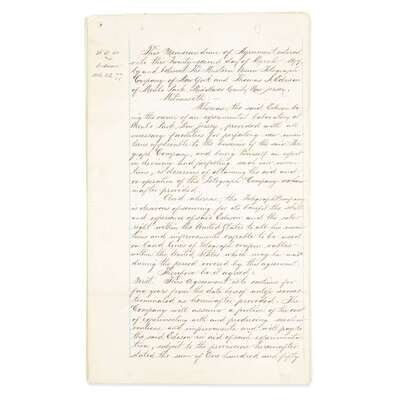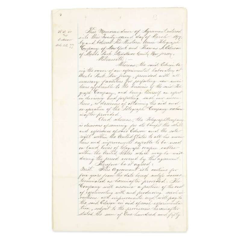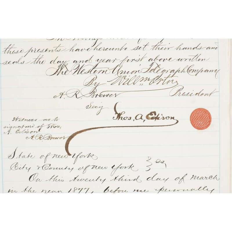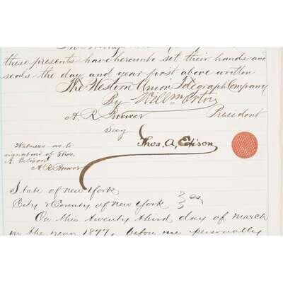 New York, March 22,1877. 10 pp., on legal size paper. The first agreement between Edison and the Western Union Telegraph Co. for funding Edison's telegraphic experiments: "Whereas the said Edison being the owner of an experimental laboratory at Menlo Park, New Jersey, provided with all necessary facilities for perfecting new inventions applicable to the business of the said telegraph Company, and being himself an expert in devising and perfecting such new inventions, is desirous of obtaining the aid and co-operation of the Telegraph Company...And Whereas the Telegraph Company is desirous of securing for its benefit the skill and experience of said Edison and the sole right within the United States to all his inventions and improvements capable to be used on land lines of telegraph or upon cables within the United States which may be made during the period covered by this agreement..." Signed by Edison and counter-signed by William Orton, President of Western Union Telegraph Co., also signed twice by A.R. Brewer, Secretary of Western Union, as well as Clarence Clay, notary public. Docketed on verso. Disbound, with red binding ribbon present, lightly soild, some small closed tears and creasing along edges.