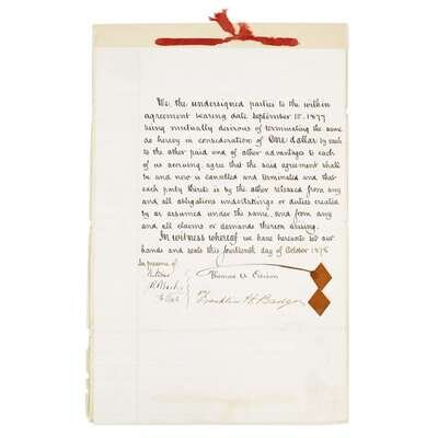 (Menlo Park, New Jersey), September 15, 1877. 4 pp., on legal size paper. Agreement to commercially introduce Edison's telephones in Canada. Signed by Edison and countersigned by Charles Batchelor, Edison's co-inventor and principle partner, as witness, as well Franklin H. Badger, Canadian electrician chosen to lease Edison's telephones in Canada. Docketed on verso. Bound with: Memorandum extended from above document, further delineating Badger's role in marketing Edison's telephone in Canada. 2 pp., on legal size paper. Signed by Badger and witness E.S. Cathels. Also bound with: (Menlo Park, New Jersey and Montreal, Canada), October 14 and December 2, 1878. 2 pp., on legal size paper. Agreement terminating the previous two agreements. Signed by Edison, J.B. Reach as witness, as well as Badger and Charles Bourne, Treasurer of the Montreal Telegraph Company.