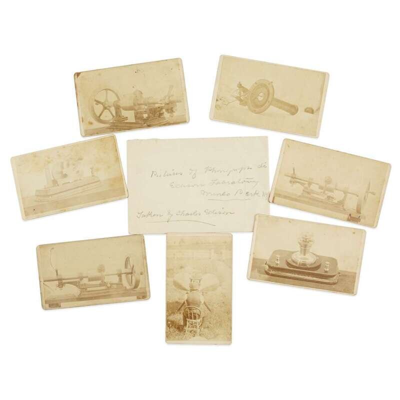 Menlo Park, New Jersey, 1878. Seven mounted albumen prints on card. Each photograph depicting different sound equipment such as the phonograph, megaphone, and chemophone. Five photographs with Thomas Edison's Menlo Park Laboratory copyright stamp on verso, as well as Charles P. Edison's signature, date, and insciption identifying each object; two photographs with no stamp or inscription; and one photograph with an additional gift inscription from lab assistant Herbert S. Read to Flora M. O'Brien, dated June 29, 1888. Included are nine paper copy photo reproductions and one envelope.