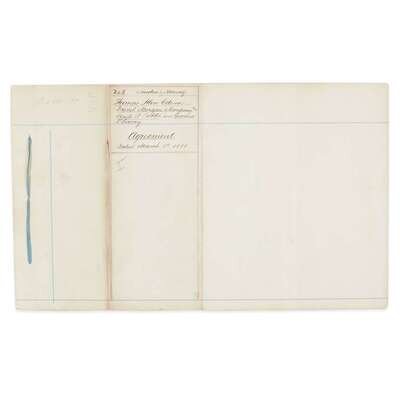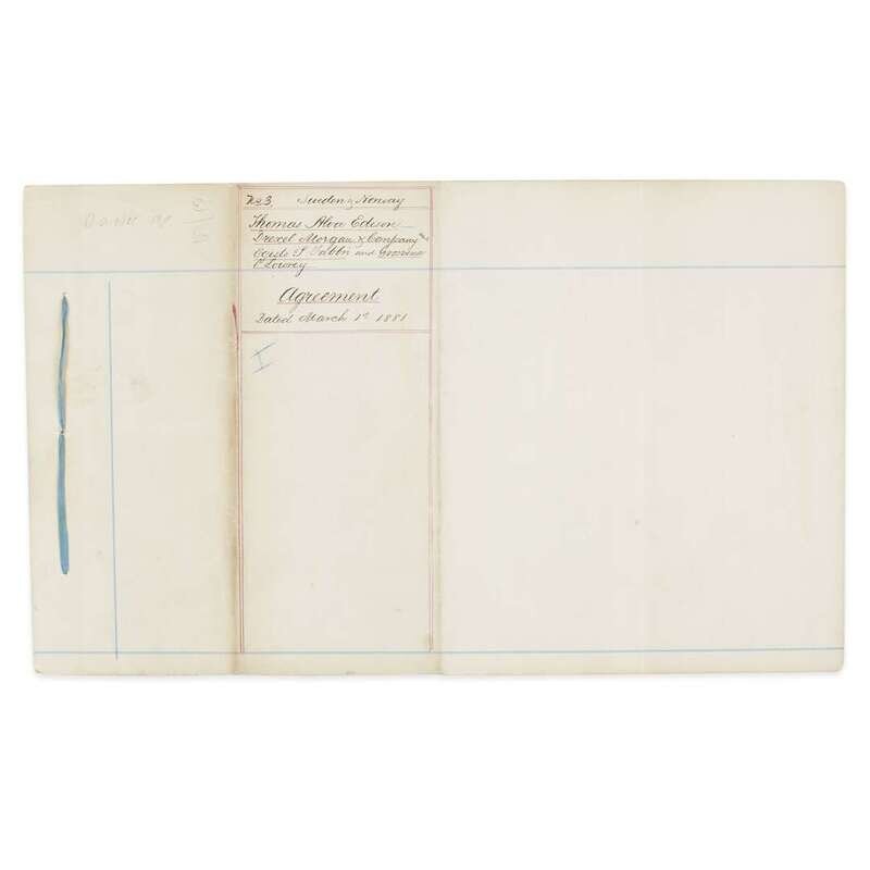 New York: March 1, 1881. 7 pp. on legal size paper, bound with blue ribbon at top; verso of final leaf docketed "no. 3 Sweden & Norway...Agreement..." Manuscript contract involving Edison, the financial firm Drexel, Morgan and Company, counselors Egisto P. Fabbri and Grosvenor P. Lowrey for patent assignments, licenses, and royalties in Sweden and Norway for inventions by Edison relating to electric lighting and power. Signed twice by Edison, Drexel, Morgon & Co., Fabbri and Lowery, and additionally signed by notary public Richard E. O'Brien. Very lightly toned, creasing from original folds.
