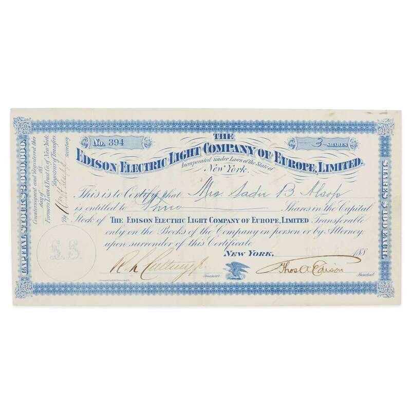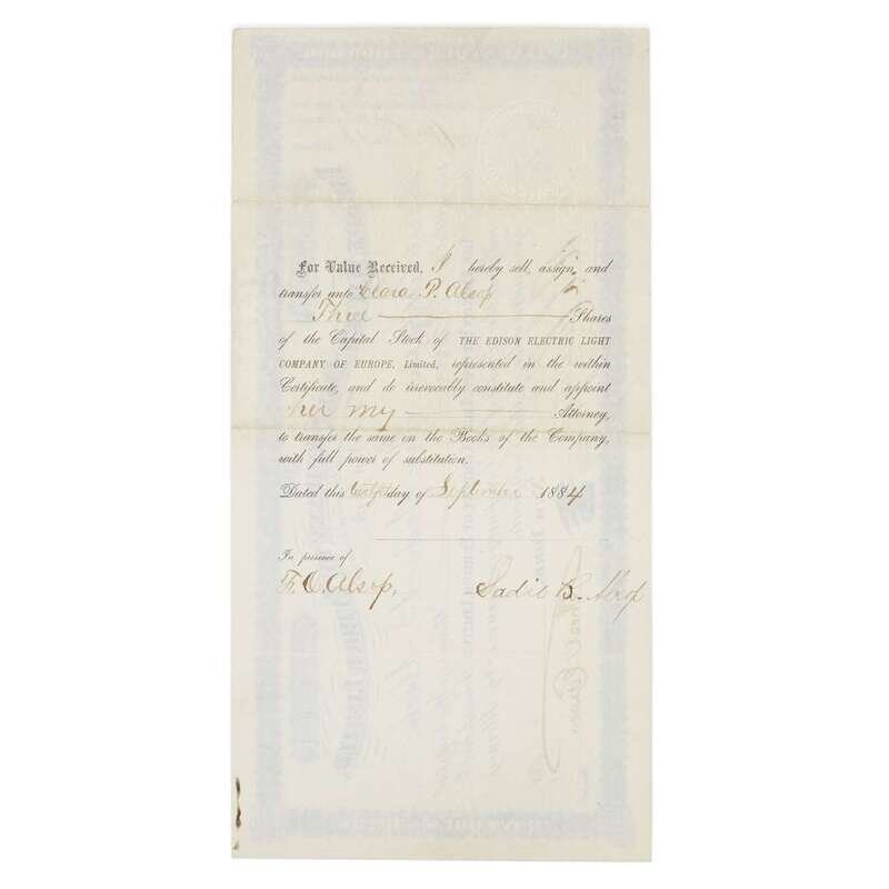 [Science, Medicine & Mathematics] [Edison, Thomas A.] Signed Edison Electric Light Company of Europe, Limited Stock Certificate