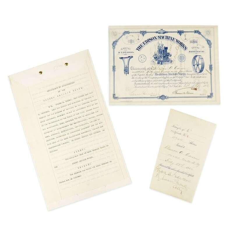 New York: Feb(ruar)y 23, 1886. Certificate #1. Edison's personal stock certificate for 4,764 shares, signed "Thomas. A. Edison" as President of the company and countersigned and cancelled by Samuel Insull as Secretary; additionally signed by Edison and Insull on verso. Engraved and blindstamped document with filled-in manuscript, separating along folds at center; with stub separated but present. Including typed copy of Certificate of Incorporation for Edison Machine Works, unsigned and dated February 1, 1884, as well as one tobacco card of Edison.