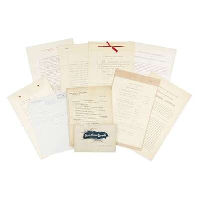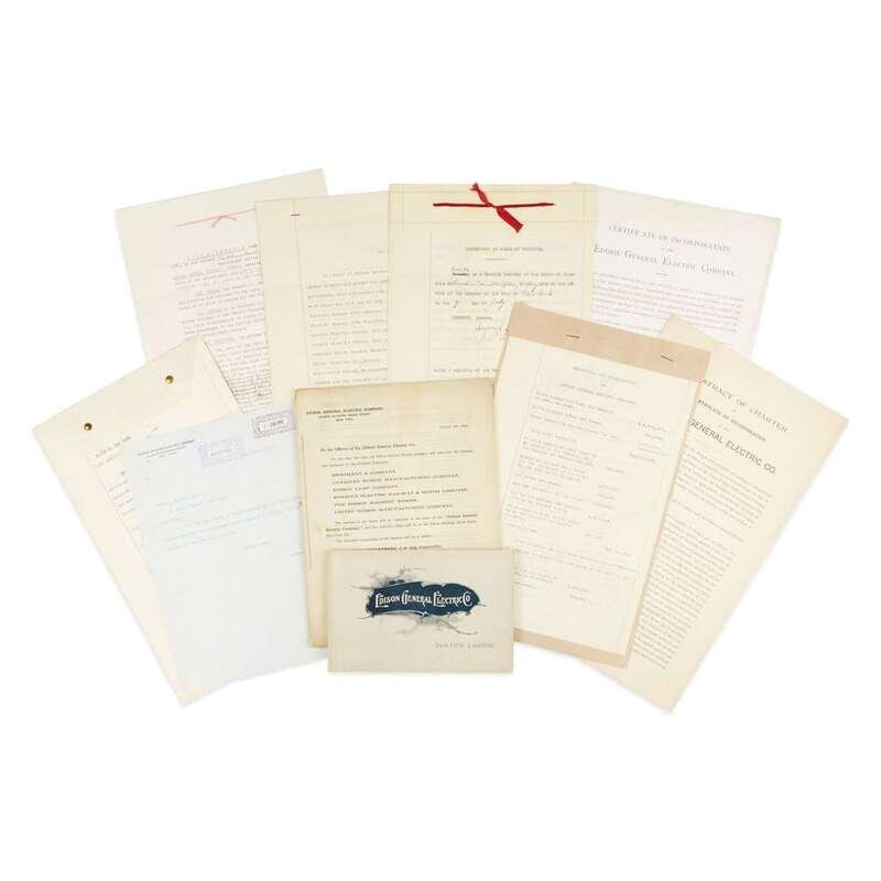 Including: 1. Minutes of a Special Meeting of the Board of Trustees of Canadian Edison Manufacturing Company. New York: July 7, 1890. 2 pp. typed on legal paper, bound with red silk tie, filled in with manuscript; with creases at old folds and very light wear. Documenting a resolution of the board of trustees of Canadian Edison Manufacturing Company to transfer its property into the possession of Edison General Electric Company. 2. Acknowledgement of Transfers, signed by Samuel Insull. New York: August 1, 1890. 6 pp. typed to rectos only of legal size paper, staple bound at top edge; first leaf stating that the following five leaves encompass agreements between the Edison General Electric Company and Bergmann & Company, The Edison Machine Works, Edison Lamp Company, United Edison Manufacturing Company, and Canadian Edison Manufacturing Company: "Said agreements purport among other things, to transfer to Edison General Electric Company all the property of said Companies." Signed by New York Comptroller and Samuel Insull. 3. Agreement between The Edison Machine Works, Edison General Electric Company, and Edison Electric Light Company, signed. August 6, 1890. 1 1/4 pp. and cover sheet on three leaves of legal size paper, bound at top edge with red string, faint creases at old folds; signed to p. 2 recto by Thomas A. Edison, W. A. Gibson, Samuel Insull, and other company executives, with the embossed stamp of each of the three companies. Documenting the agreement to release The Edison Machine Works from all contracts with Edison Electric Light Company, and transfers responsibility of carrying out existing contracts to Edison General Electric. 4. Booklet of memoranda announcing the Edison General Electric Company merger. New York: August 1, 1890. Unpaginated, bound with blue string. Consisting of several memoranda in letter format addressed to various departments and officers within the six companies that were merged with Edison General Electric (Bergmann & Company, Canadian Edison Manufacturing Company, Edison Lamp Company, Sprague Electric Railway & Motor Company, The Edison Machine Works, and United Edison Manufacturing Company) all unsigned, one with a single correction in red pencil, with some light toning and soiling, faint vertical crease. 5. Transcript of the Certificate of Incorporation of the Edison General Electric Company. Albany, New York: February 18, 1892. 2 1/4 pp. on two printed sheets, with minor creases and two short closed tears at old folds; affixed to which is a notarized sheet signed by New York Secretary of State Frank Rice, stating that the attached transcript is identical to the original certificate of organization, which was filed on April 23, 1889. With a transcript of the Abstract of Charter for the Edison General Electric Company. 6. Certification of Capital Stock value for Edison General Electric. New York: June 10, 1892. 3 pp. typed on legal-size paper, bound with two metal clasps at top edge, certifying that the company's capital stock is $15 million, signed by witnesses including H. Villard, Samuel Insull, and A. Marcus; signed and notarized by Arpad von Barber. With accompanying letter addressed to Eaton & Lewis and signed by the Comptroller requesting aforementioned certification of capital stock. 7. Memorandum for Organization of Edison General Electric Company. No date. 3 pp. typed on legal size paper, bound with staples at top edge. Unsigned document detailing the arrangement of stock payments to an unnamed trustee.