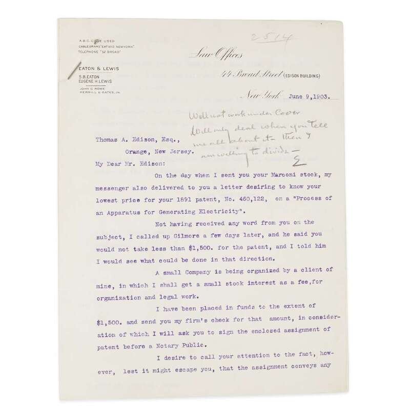 New York, June 9, 1903. 2 pp. 4to, on law firm Eaton & Lewis stationary. From Lewis, Edison's attorney, to Edison regarding the selling of one of his patents, and informing Edison about the formation of a new company in which Lewis will serve as director.