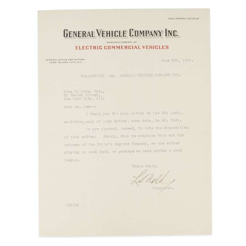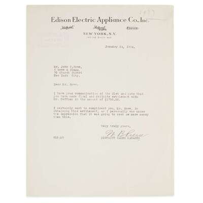 New York, January 5, 1914. 1 p. 4to, on General Vehicle Company Inc. stationary. From General Vehicle Company Inc. Treasurer to John C. Rowe, Edison's patent attorney, regarding Walangewich vs. General Vehicle Company Inc. With: New York, January 24, 1924. 1 p. 4to, on Edison Electric Appliance Co., Inc. stationary. From Edison Electric Appliance Co., Inc. District Sales Manager W.B. Pierce to John C. Rowe, Edison's patent attorney, regarding a settlement Rowe made with a Mr. Hoffman in the amout of $1,750. Including two photgraphs of Thomas Edison.