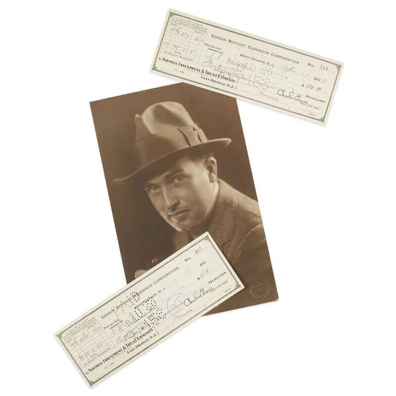 Two checks issued by the Edison Botonic Research Corporation. Signed by Charles Edison, and filled in and dated "Apr. 11 1928" and "Apr. 5 1928" for the amounts of $40 and $86 by another hand. Drawn from the Savings Investment & Trust Company, East Orange, N.J; each with perforated "paid" stamps. Including a photograph of Charles Edison, with Thomas A. Edison's copyright stamp on verso.