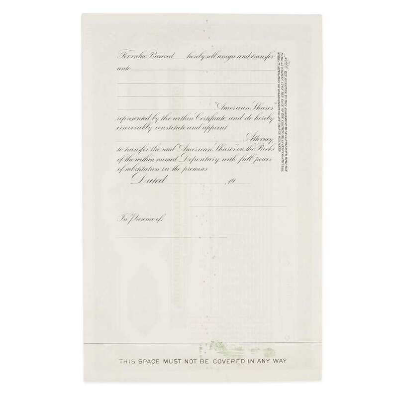 New York, no date. Unissued and unsigned specimen for 100 American shares. Engraved document, with two perforations at bottom edge.