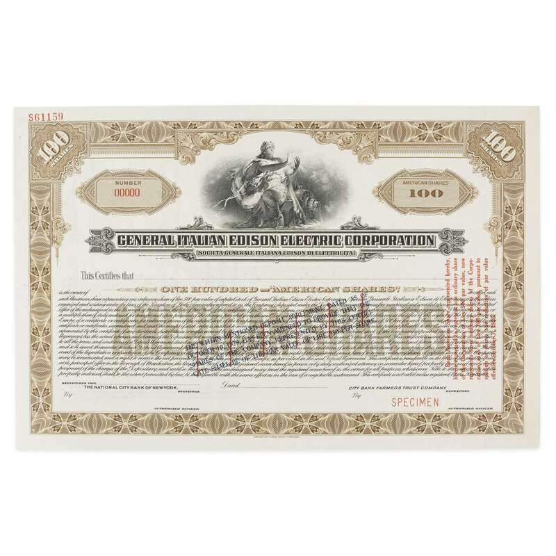 [Science, Medicine & Mathematics] [Edison, Thomas A.] General Italian Edison Electric Corporation Stock Certificate