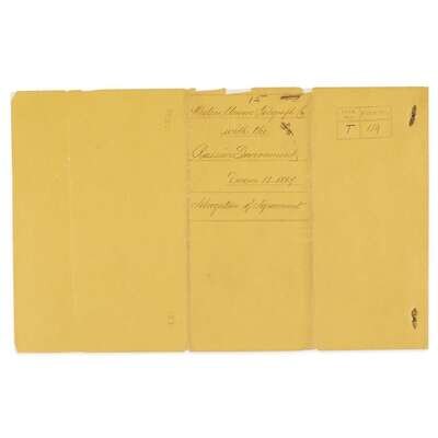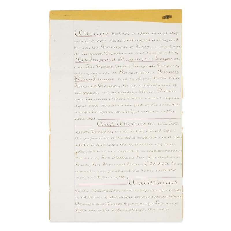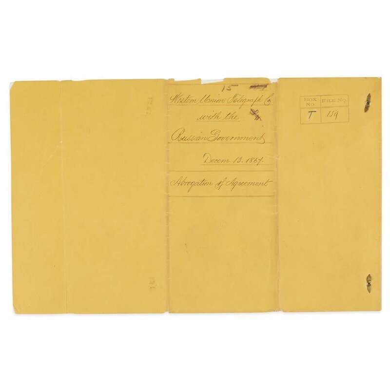 New York: December 13, 1867. 3 1/3 pp. on legal size paper, bound at the top edge with metal clasp and orange paper backing, signed by William Orton of the Western Telegraph Company. Agreement between His Imperial Majesty the Emperor of Russia and The Western Union Telegraph Company acting through plenipotentiary Hiram Sibley, in acknowledgement of the decision to discontinue their attempts to run a telegraph cable from Alaska to Siberia. The agreement notes that the project incurred expenses upwards of $2,575,000.