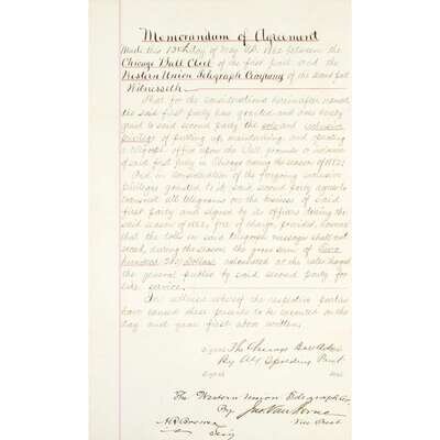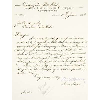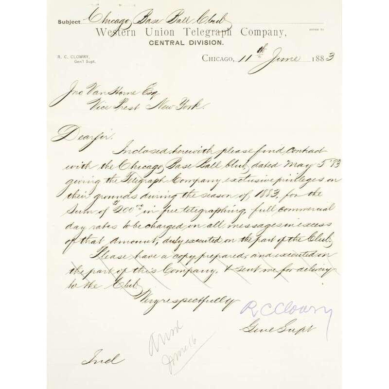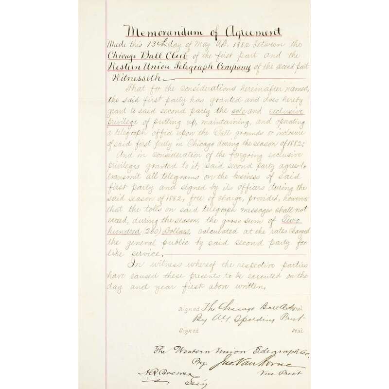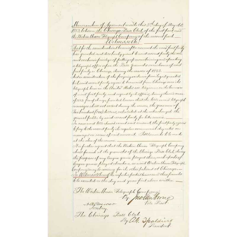 Including: 1. Manuscript document, signed. [Chicago]: May 13, 1882. 1pp. on watermarked laid legal size paper, signed "The Chicago Ball Club / By A. G. Spalding Prest.", and signed by A. R. Brewer and John Van Horne as Secretary and Vice President of the Western Union Telegraph Company; minor creasing to old folds, Western Union embossed seal to bottom margin, just touching Brewer's signature, very minor wear to edges, docketed to verso, signatures clear and dark. Memorandum of agreement between the Chicago Ball Club and The Western Union Telegraph Company, granting to the second party "the sole and exclusive privilege of putting up, maintaining, and operating a telegraph office upon the Ball grounds ... during the season of 1882." 2. Manuscript document, signed. [Chicago]: May 5, 1883. 1pp. legal size paper, signed by Albert G. Spalding, A. R. Brewer, and John Van Horne. Memorandum of agreement between the Chicago Ball Club and the Western Union Telegraph Company, signed by Spalding as President of the Chicago Ball Club, and by Brewer and Van Horne as Secretary and Vice President, respectively, of Western Union; with embossed seal of Western Union Telegraph Company overlapping Brewer's signature; moderate creasing at old folds, very light wear to edges with tiny closed tears at folds, old staple marks to upper margin, not affecting text; signatures very slightly browned but clear. Memorandum of Agreement between the Chicago Ball Club and the Western Union Telegraph Company allowing the latter to operate a telegraph office on the ball grounds for the season of 1883, and requiring them to "furnish at the grounds of the Chicago Ball Club, during the progress of any league game played there, such reports of league games played elsewhere". With corresponding autograph letter addressed to John Van Horne and signed by R. C. Clowry, noting that the agreement has been enclosed.