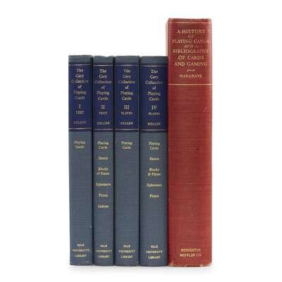 Hargrave, Catherine Perry A History of Playing Cards and a Bibliography of Cards and Games Boston: Houghton Mifflin, 1930. First edition. 4to. Original brick red cloth, gilt-lettered spine, corners bumped, other light to moderate edge wear; hinges stressed. Illustrated with color frontispiece, color plates with lettered tissue guards, as well as full page and text illustrations. With Keller, William B. A Catalogue of the Cary Collection of Playing Cards in the Yale University Library New Haven: Yale University Library, 1981. In four volumes. First edition. 4to. Original blue cloth; light to moderate shelf wear. Illustrated with color frontispieces and numerous plates.
