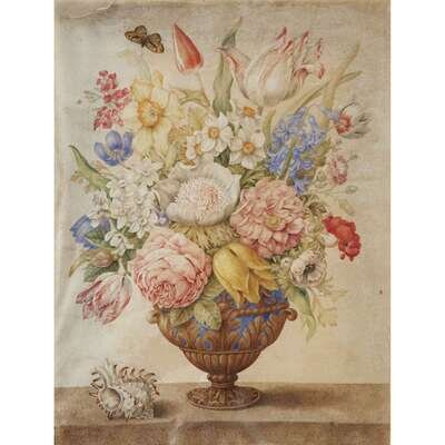 Giovanna Garzoni (Italian, 1600–1670) Flowers in a Lapis-Lazuli Vase on a Marble Top with a Conch Shell and a Monarch Butterfly