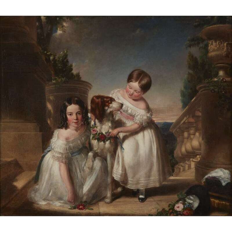 Attributed to Sir Francis Grant (British, c.1803–1878) Two Girls with Their Dog at the Entrance of a Garden