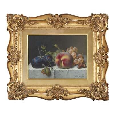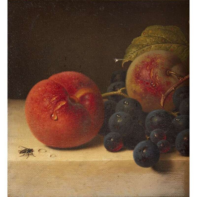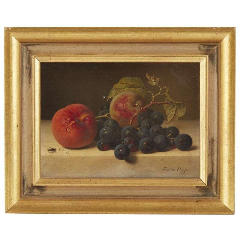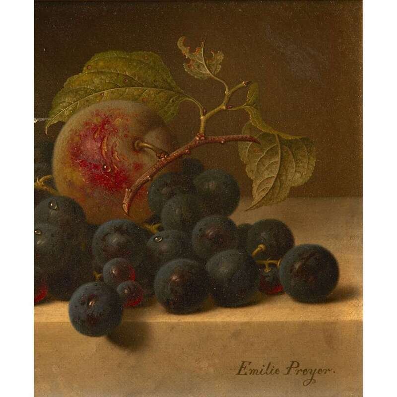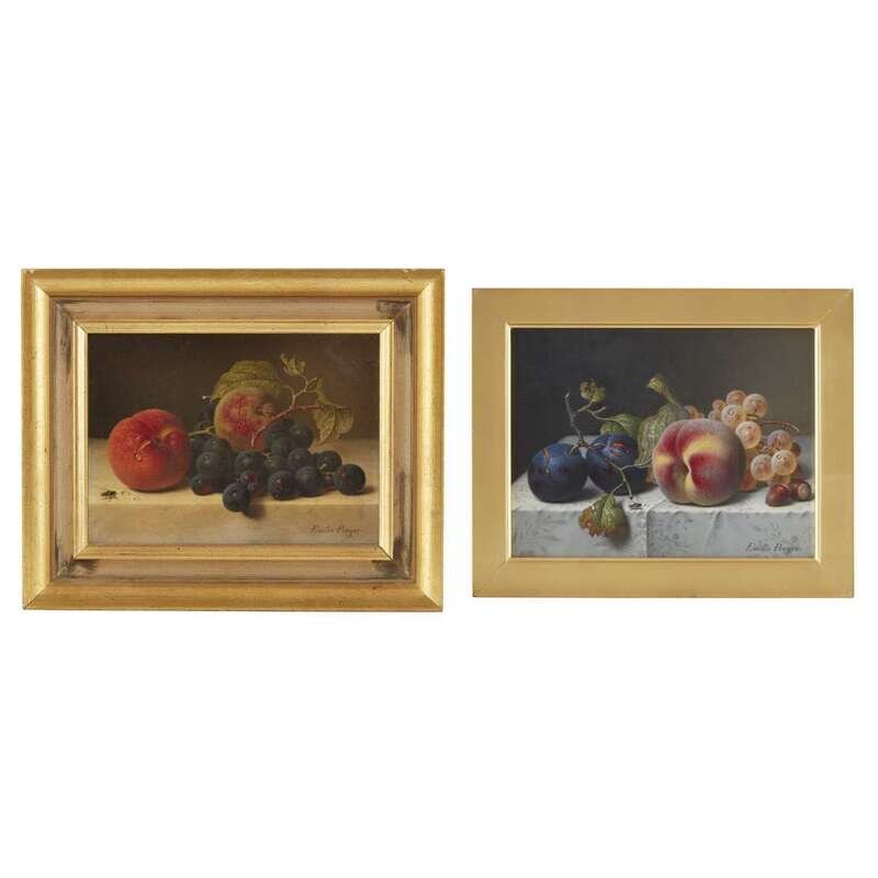 Emilie Preyer (German, 1849–1930) Still Life with Peach, Plums, Grapes and Hazelnuts with Fly on a Tablecloth; together with a companion painting