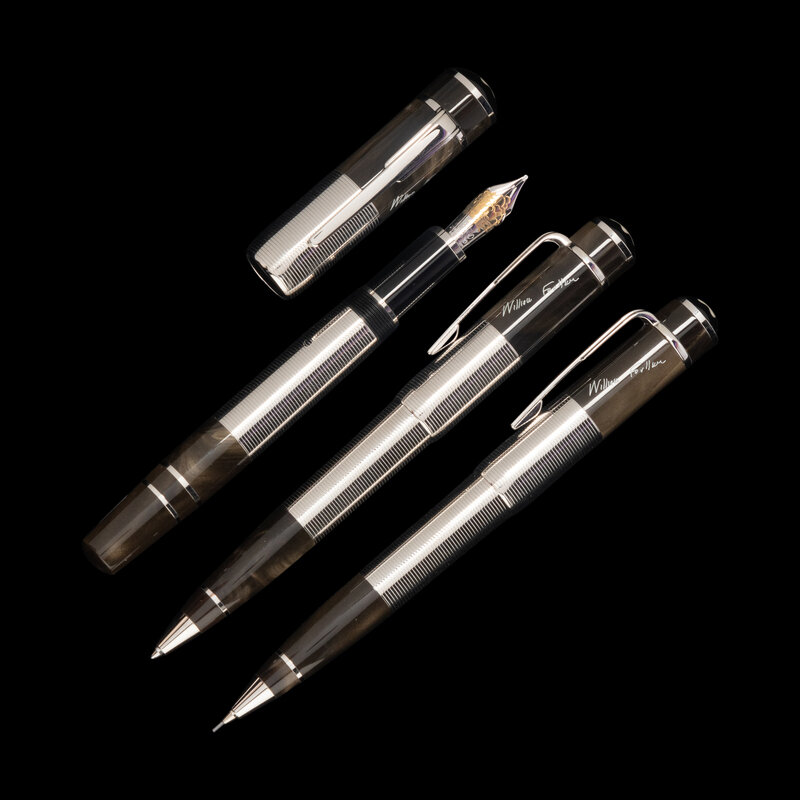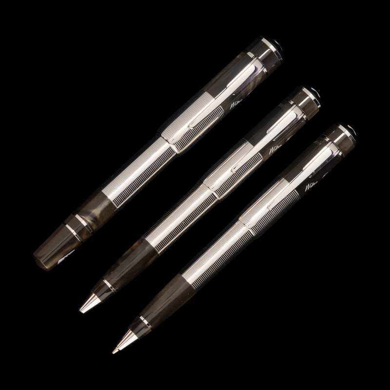 the fountain pen numbered 830/16000 and having an 18-karat bi-color gold M nib, the rollerball pen numbered 830/18000, the mechanical pencil numbered 830/4000.