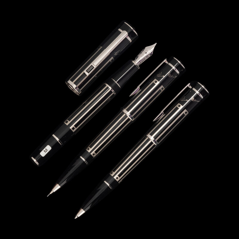 the fountain pen numbered 385/12000 and having an 18-karat white gold M nib, the rollerball pen numbered 385/15000, the mechanical pencil numbered 385/3000.
