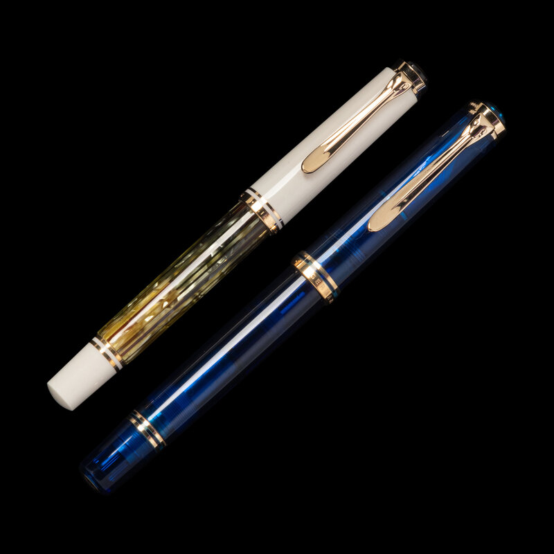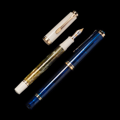 comprising a Souverän example with a 14-karat gold M nib and a Limited Edition translucent blue fountain pen numbered 4440/5000 and having an 18-karat gold F nib.