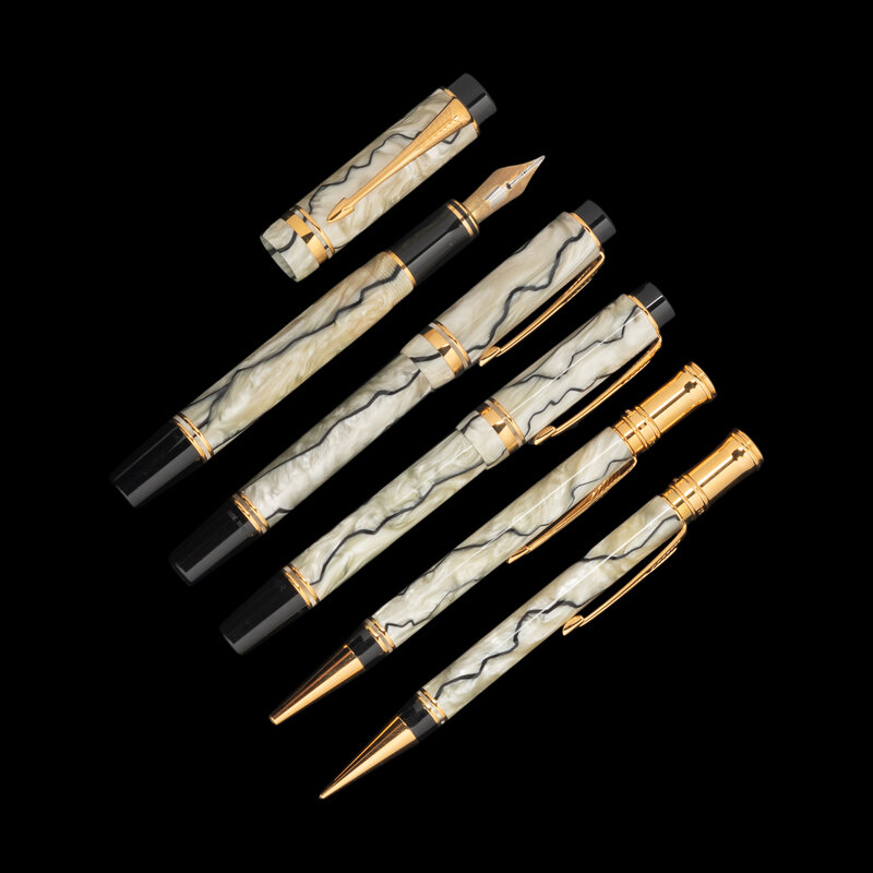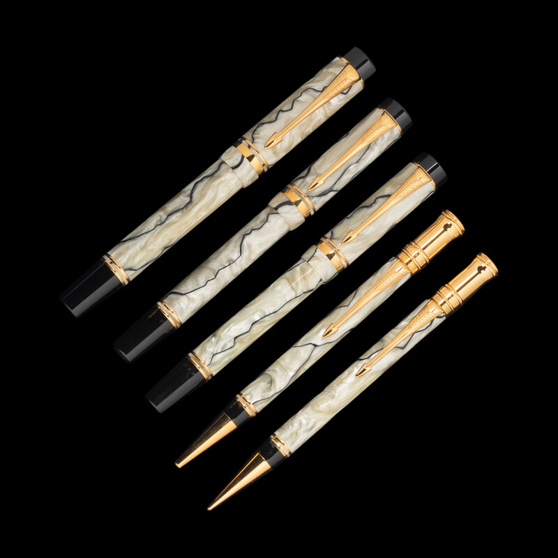 comprising two Duofold Fountain pens, one having an 18-karat gold M nib the other with an F nib, Duofold rollerball pen, twist-action rollerball pen and a mechanical pencil.