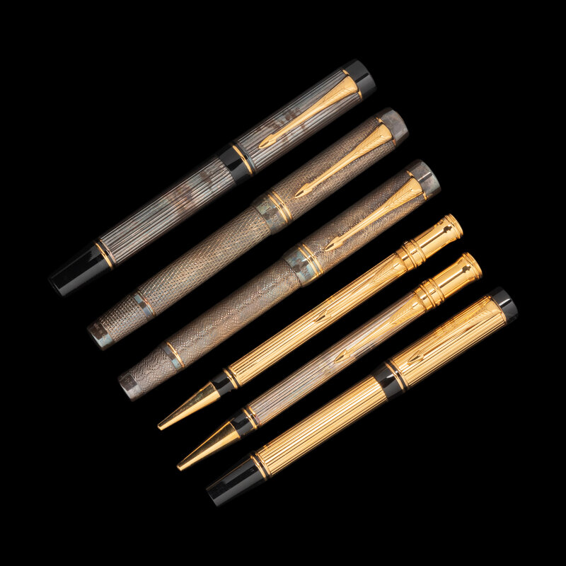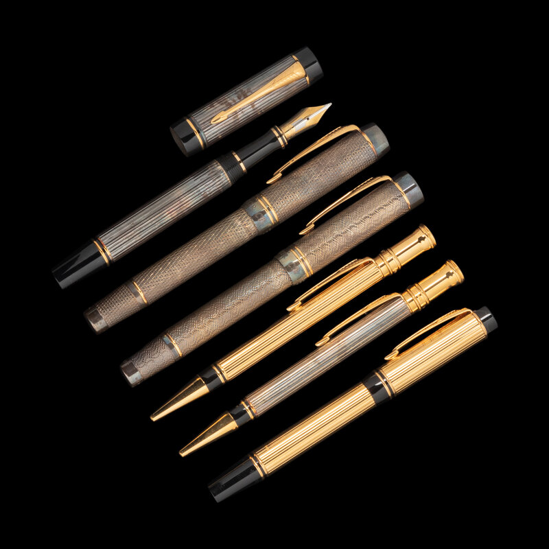 comprising a pair of limited edition Classic Pens fountain pens each numbered 156/1888 and having an 18-karat gold M nib, a silver-plated Duofold fountain pen and twist-action rollerball pen set and a gold-plated Duofold fountain pen and twist-action rollerball pen set.