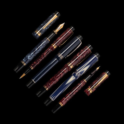 comprising a limited edition True Blue fountain pen with an 18-karat white gold and numbered '1629/5000', a Centennial commemorative fountain pen with an 18-karat M-83 nib, a Duofold fountain pen with an 18-karat white gold F nib, and a fountain pen, rollerball pen and mechanical pencil set, the fountain pen having an 18-karat 21-F nib.