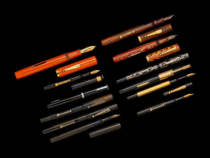 comprising a No. 58-Red Hard Rubber fountain pen with #8 nib (lacking lever), silver-cased No. 52 1/2 fountain pen with an engraved monogram to body and a #2 nib, No. 94-Rose Ripple fountain pen, No. 55-Red Ripple fountain pen, and eight others.