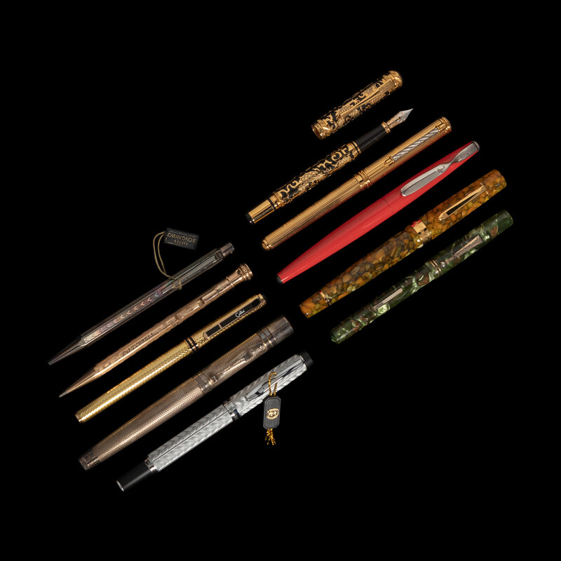 comprising a Bexley fountain pen with an 18-Karat B nib, a Yellow-Gold decorated fountain pen with dragon motifs throughout with a 14-karat gold nib, a Paul Smith fountain pen, a gold-plated Philippe Charriol fountain pen with and 18-karat M nib, a Charles Hubert fountain pen with an Iridium nib, a Sterling-Silver Yard-o-Led fountain pen, a Wahl-Eversharp fountain pen, a Colibri fountain pen, Caran d'Ache rollerball pen and filled-gold pencil with a Knights of Columbis insignia at end, the body engraved F.J. Tyrrell.