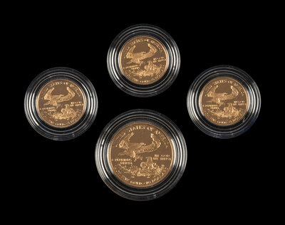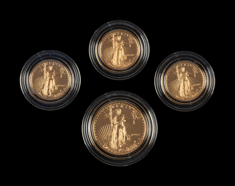 comprising a 1993 $10 1/4 oz. and three 1990 $5 1/10 oz. examples, each having a mint issued display booklet, certificate of authenticity and box.