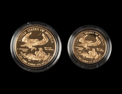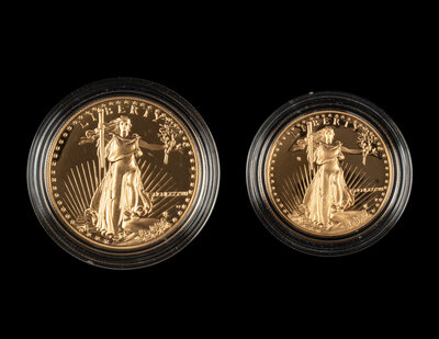 Comprising a 1987-W $50 (1 oz.) and a 1987 $25 (½ oz.) example with mint-issued display book, papers and outer box.