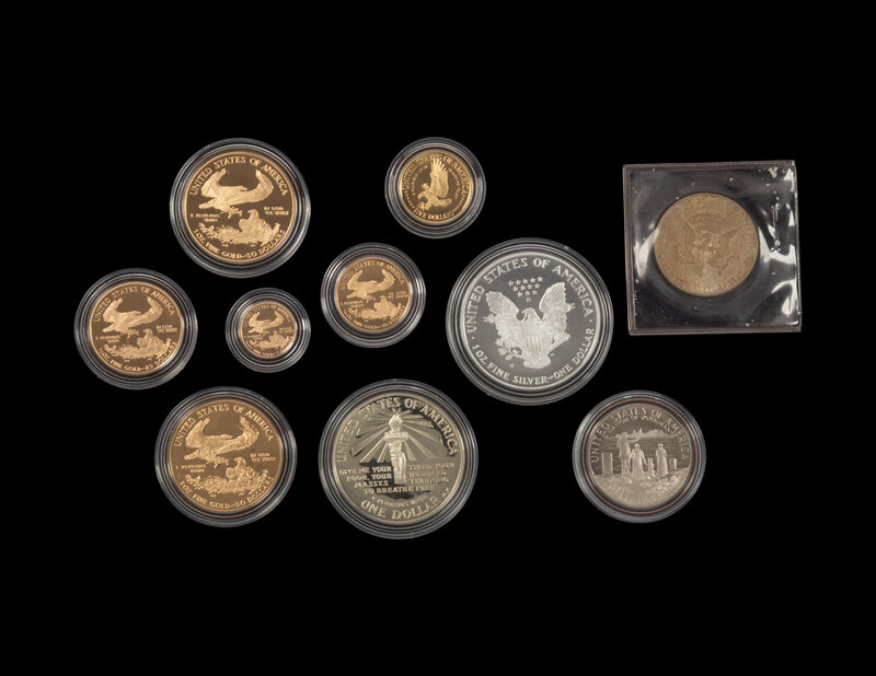 Comprising a 1986-W and 1995-W Gold Eagle $50 (1 oz.), 1995-W Gold Eagle $25 (½ oz), 1995-W Gold Eagle $10 (¼ oz.), 1995-W Gold Eagle $5 (1/10 oz.) 1986-W Statue of Liberty $5 gold (1/4 oz), 1986 Ellis Island $1 silver and a 50c silver example and a 1995 Silver Eagle $1 example, together with a 1966 Kennedy 50c coin. 10 items total