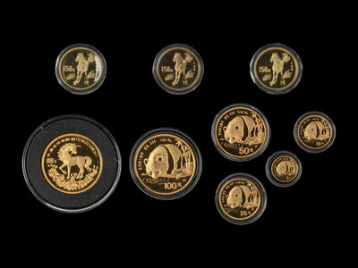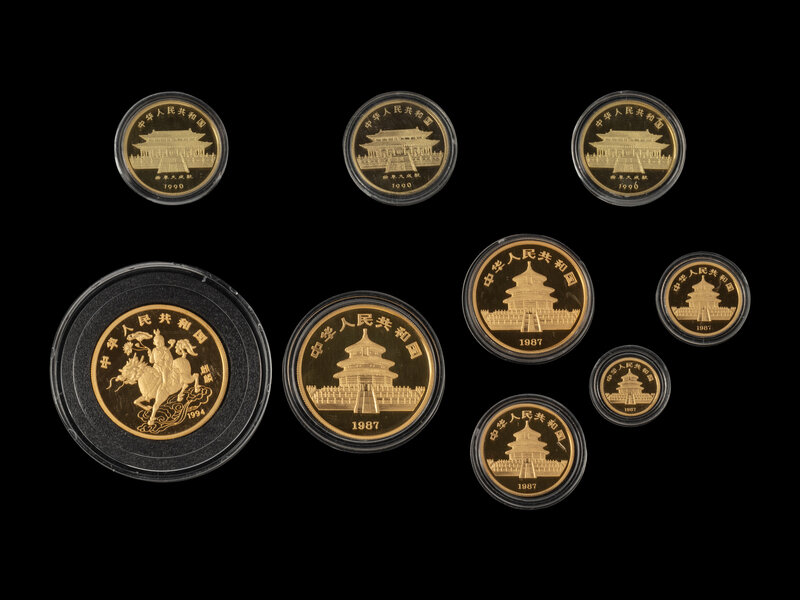 Comprising a 1994 100-Yuan Unicorn (1 oz.), 1987 Panda five-coin proof set with 100-Yuan (1 oz.), 50-Yuan (½ oz.), 25-Yuan (¼ oz.), 10-Yuan (1/10 oz.) and 5-Yuan (1/20 oz.) examples and set of three 1990 Year of the Horse 150-Yuan (8 g.) examples.