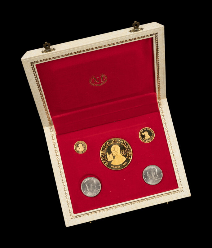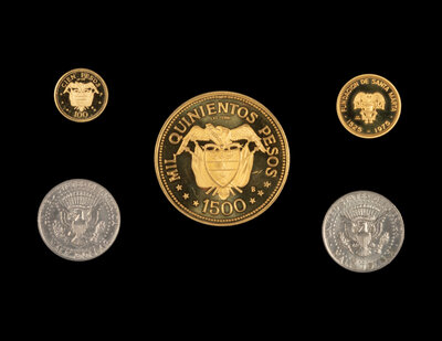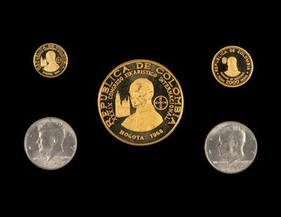 comprising a 1968 39th International Eucharistic Congress Commemorative 1500 Peso gold coin (64 g), Rodrigo de Batidas-Fundaction de Santa Maria 2000 peso gold coin (8.6 g) and a 39th International Eucharistic Congress Commemorative 100 peso coin (4.5g), together with two post-1964 Kennedy 50c coins.