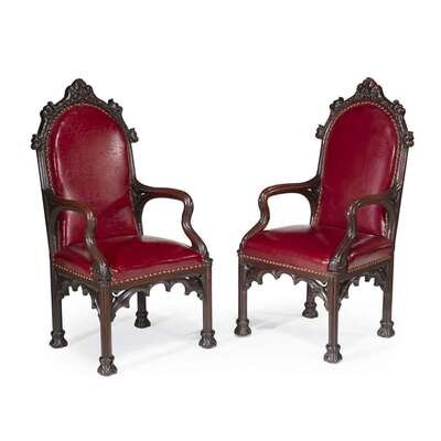 Rare pair of Herrick-Maynard-Hatch Gothic Revival carved oak dining arm chairs Designed by Alexander Jackson Davis (1803-1892), New York, Mady by Burns and Brother, New York, for Ericstan, Tarrytown, New York, circa 1857