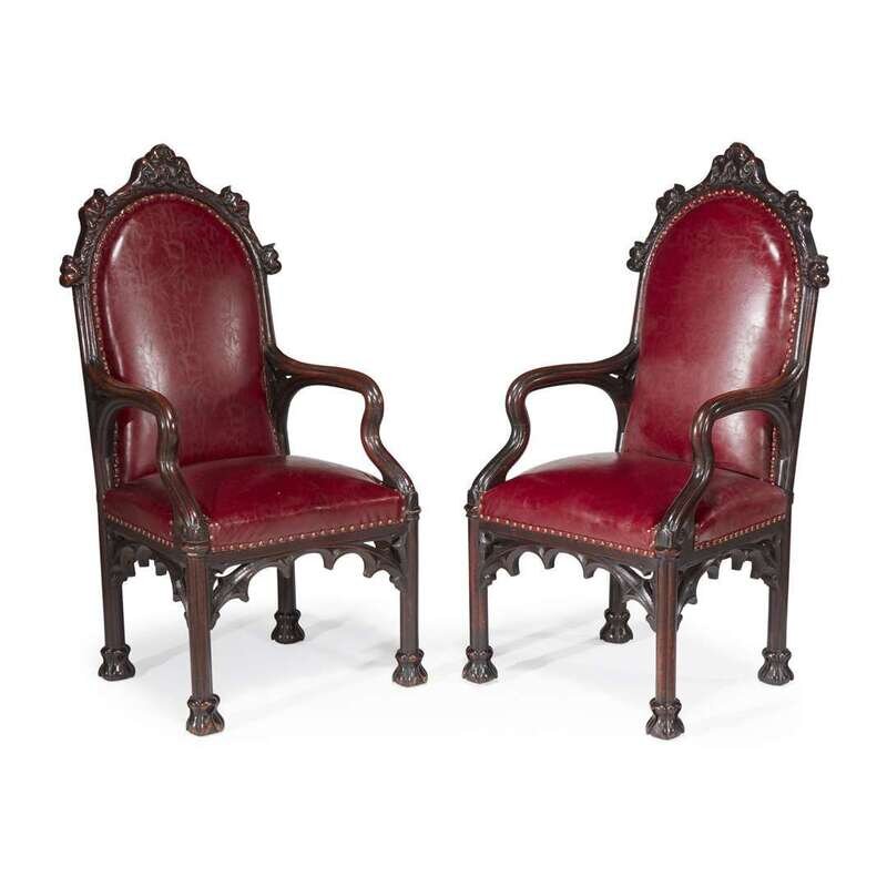 Rare pair of Herrick-Maynard-Hatch Gothic Revival carved oak dining arm chairs Designed by Alexander Jackson Davis (1803-1892), New York, Mady by Burns and Brother, New York, for Ericstan, Tarrytown, New York, circa 1857