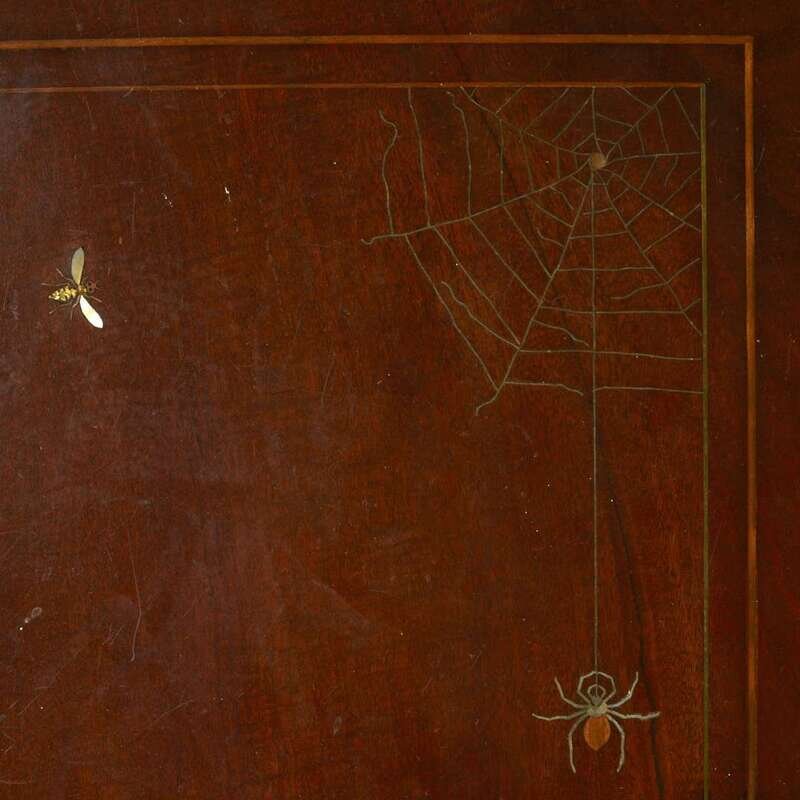 With floral-carved brackets, the top inlaid with mixed metals and mother-of-pearl spider, web, and fly; the feet ending in brass sabots.