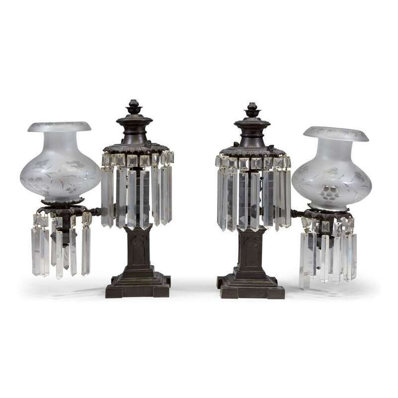 Pair of Gothic Revival patinated bronze Argand lamps first quarter 19th century
