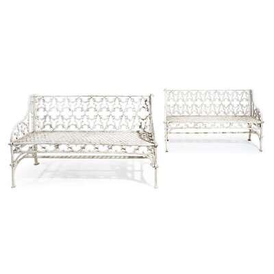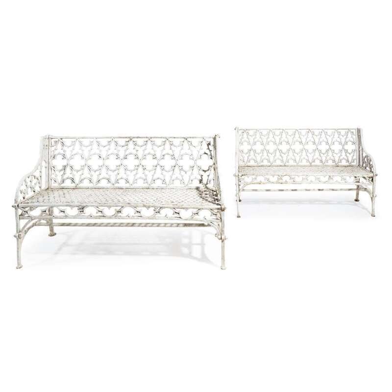 Pair of Gothic Revival white-painted cast iron garden benches 20th century