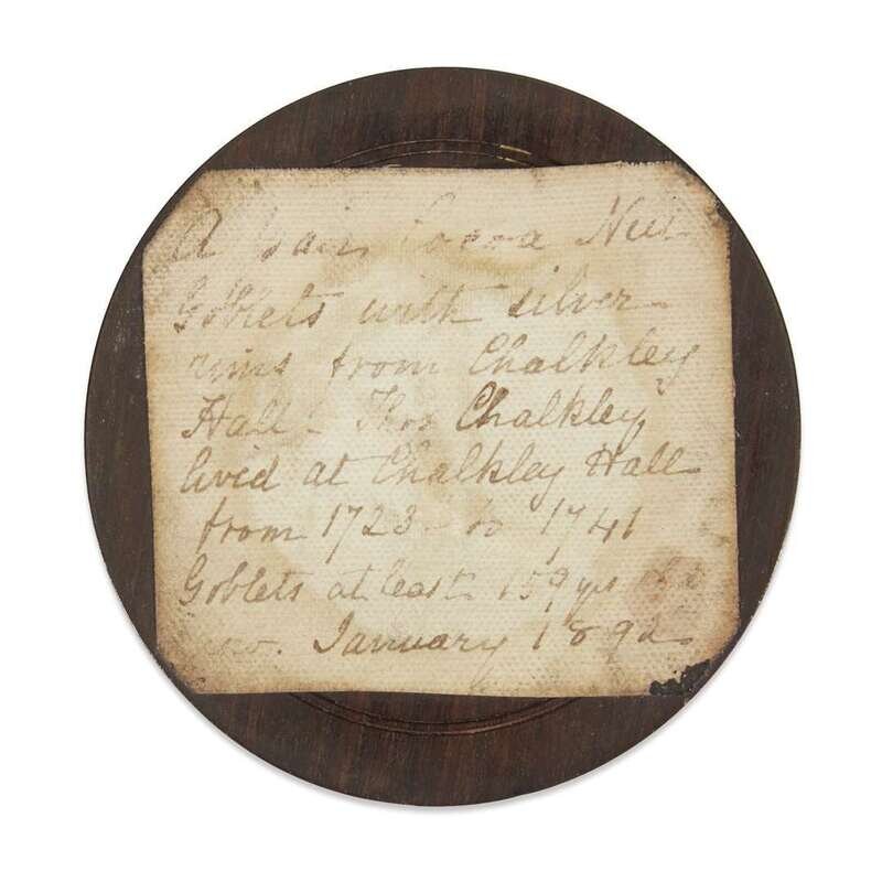 For travel use, each stem with threaded top to fit into bowl, underside of one goblet with paper label inscribed, "A pair cocoa nut goblets with silver rims from Chalkley Hall. Thos. Chalkley lived at Chalkley Hall from 1723 to 1741. Goblets at least 159 yrs old now. January 1892."