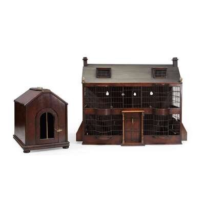 Victorian house-form mahogany and wirework birdcage and a mahogany small pet carrier England, 19th century