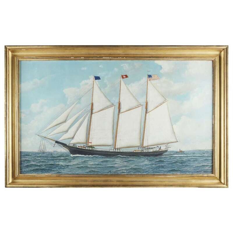 Antonio Jacobsen (American/Danish, 1850-1921) Portrait of the Schooner Georgie L. Drake in open waters, 1906