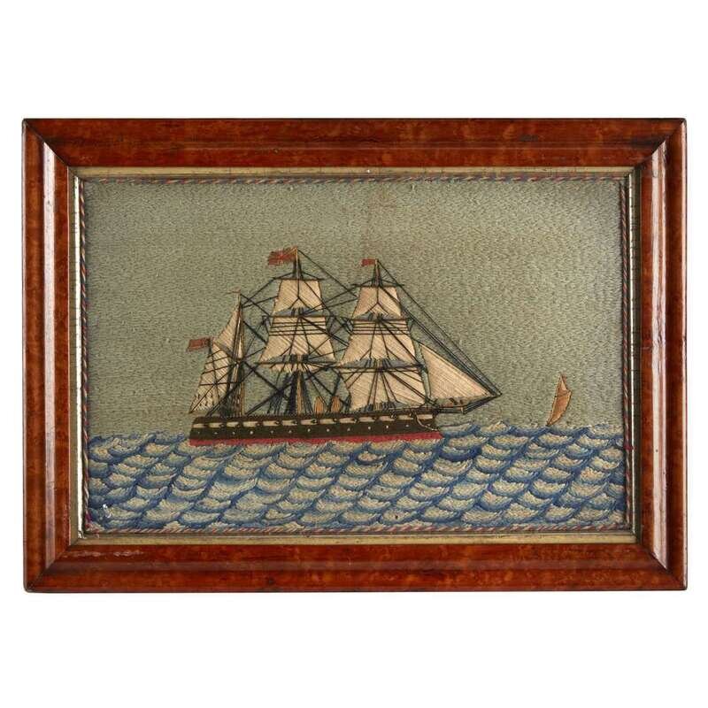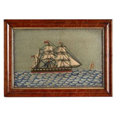 Wool and silk threads depict fully-rigged ship, beadwork cannon, bird's-eye maple frame.