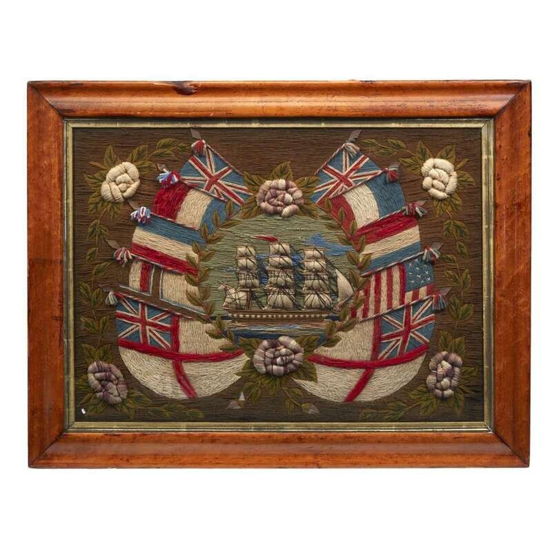 Port-hole view of three-masted ship within panoply of international flags and floral border, bird's eye maple frame.