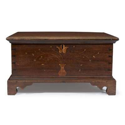 In the form of a miniature blanket chest, interior fitted with till, inlaid with vase, tulip, and winding vine motifs.