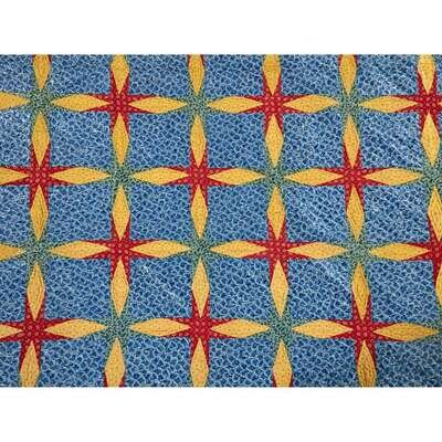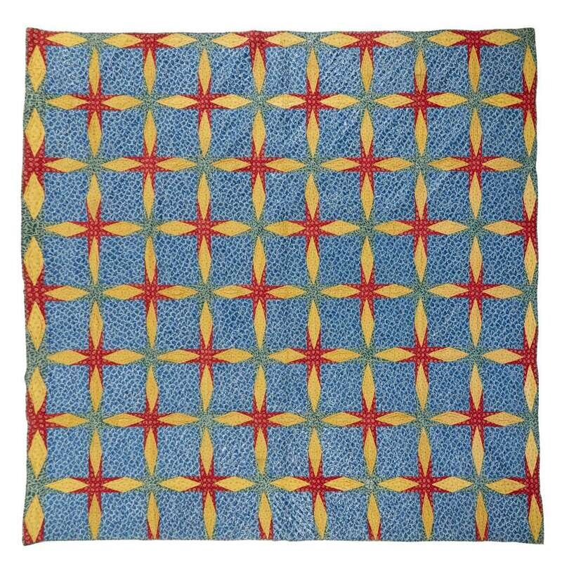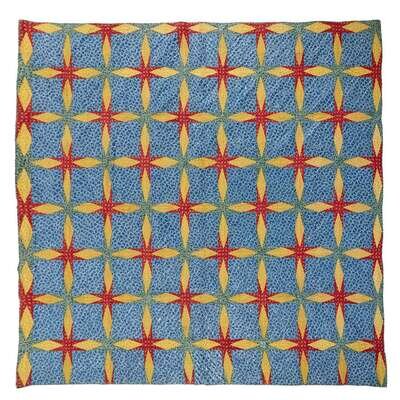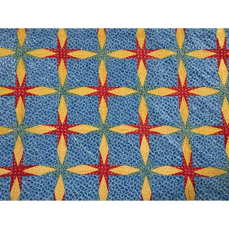 Pieced with glazed and unglazed floral and leaf printed fabrics in an unusual four-pointed star pattern, heightened by diagonal line quilting.