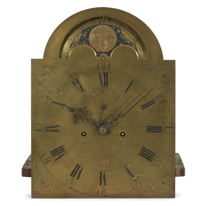Brass face with moon dial, the brass face engraved, "Jn. Wood, Philadelphia."