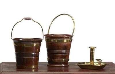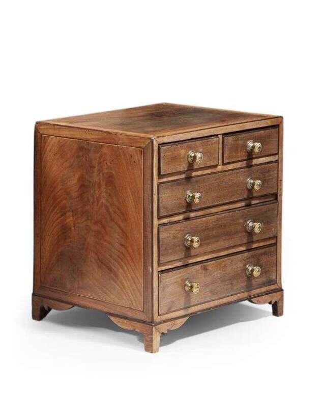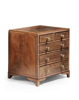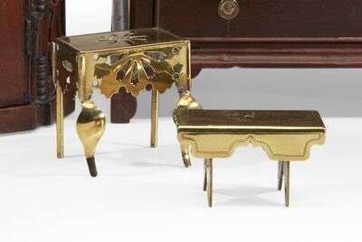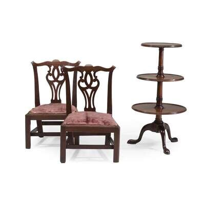 Including a pair of Chippendale mahogany side chairs, a Queen Anne-style mahogany dumbwaiter, two miniature brass-bound peat buckets, four miniature brass items, and a miniature chest of drawers.